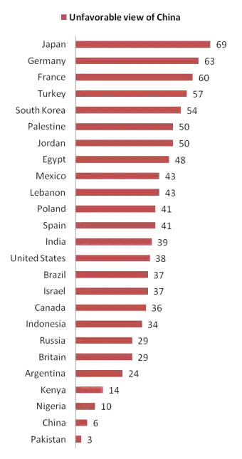 Perspectivas desfavorables de la República Popular China (2009). Las opiniones negativas de China son especialmente fuertes en Japón, Alemania y Francia.
