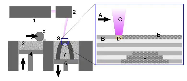 1.- Láser. 2.- Sistema de escaneo. 3.- Sistema de dispensación de polvo. 4.- Pistón de dispensación de polvo. 5.- Rodillo. 6.-. Pistón de fabricación 7.- Plataforma para polvo de fabricación 8.- Objeto siendo fabricado (ver inserto)