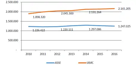 El gráfico 2 muestra la evolución de afiliados según las principales instituciones prestadores del SNIS: IAMC y ASSE donde puede apreciarse que Entre 2010 y 2016, las IAMC incrementaron 14% sus afiliados, mientras que en ASSE el aumento fue de 1,7%.