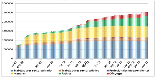 De forma general, el gráfico 2 presenta la evolución en diez años de la ampliación de la cobertura en salud asegurada por el Sistema Nacional de Salud (FONASA) donde se puede observar la incorporación de diversas categorías poblacionales. Actualmente, existe una mayor diversificación respecto a la cobertura garantizada por el FONASA: los trabajadores del sector privado representan el 38%, seguido de los menores de 18 años (24%) y los pasivos (23%). En un tercer escalón, aparecen los cónyuges y/o concubinos (8%), los trabajadores del sector público (6%) y por último los profesionales independientes (1%) (Ministerio de Salud, 2017, p.11). Gráfico 3 - Personas con afiliación FONASA por categoría (2007-2017)