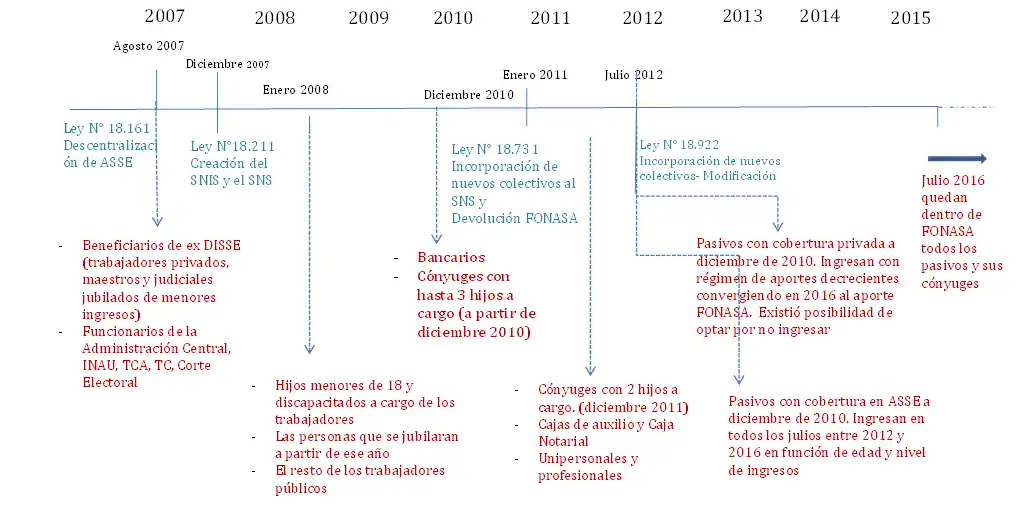 Desde un comienzo, el Seguro Nacional de Salud ampara a los beneficiarios del Seguro por Enfermedad del Banco de Previsión Social (BPS), los jubilados del BPS de bajos ingresos que hicieran la opción prevista por ley, los funcionarios públicos y otros dependientes del Estado. Con posterioridad a la Ley de Creación del Fondo Nacional de Salud (FONASA), nuevas leyes amplían la población asegurada, incorporando nuevos grupos al Seguro Nacional de Salud. De acuerdo a lo establecido en la Ley 18.211 de Creación del Sistema Nacional Integrado de Salud (SNIS), a partir del 1º de enero de 2008 se incorporaron al Seguro Nacional de Salud los trabajadores privados, los hijos menores de 18 años o discapacitados de cualquier edad a cargo de un beneficiario del seguro y aquellos activos que se ampararan a partir de esa fecha bajo al régimen jubilatorio. A su vez, dicha Ley previó la incorporación gradual de otros colectivos, como son los cónyuges de los beneficiarios del Seguro Nacional de Salud y aquellos trabajadores comprendidos en otros seguros convencionales (cajas de auxilio). Más recientemente, en enero de 2011, se aprobó la Ley 18.731 que previó la incorporación progresiva de jubilados y pensionistas al Seguro Nacional de Salud. Así, en el 2016 culminó el proceso de incorporación de diferentes grupos poblacionales al SNIS. Hasta el 2017 según el Ministerio de Salud 3.512,437 personas cuentan con cobertura integral en salud, ya sea con cobertura única o cobertura múltiple, dentro del propio sistema.