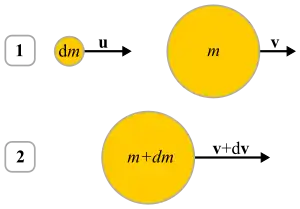 La siguiente derivación es para un cuerpo que está ganando masa. Un cuerpo con masa variable en el tiempo m se mueve con velocidad v a un tiempo inicial t. En el mismo instante, una partícula de masa dm se mueve con una velocidad u. El momento inicial se puede escribir como:[4]