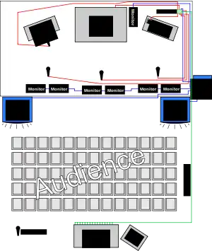 Producciones musicales más grandes frecuentemente usan una mesa de mezcla para monitores de escenario por separado, la cual está dedicada a crear mezclas en escenario o en los oídos para los ejecutantes. Estas consolas son colocadas, por lo general, a un costado del escenario, a fin de que el operador se pueda comunicar con los intérpretes.[14] En casos en los cuales los ejecutantes tengan que tocar en un recinto que no tiene un ingeniero de monitoreo cerca del escenario, la mezcla para monitores es hecha por el ingeniero de la consola en el FOH, la cual está localizada entre la audiencia o en la parte trasera de la sala de conciertos. Este arreglo puede ser problemático porque los ejecutantes terminan pidiendo cambios en la mezcla de los monitores por medio de "señales de mano y frases codificadas". El ingeniero tampoco puede escuchar los cambios que está aplicando a los monitores en el escenario, los cuales casi siempre resultan en la reducción de la calidad de la mezcla.[15]