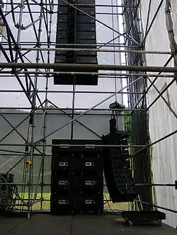Los sistemas profesionales de altavoces para refuerzo de sonido continuamente incluyen hardware dedicado a "volar" sobre el área del escenario, a fin de proveer más cobertura uniforme y maximizar la visibilidad dentro de los recintos de eventos musicales.[34]