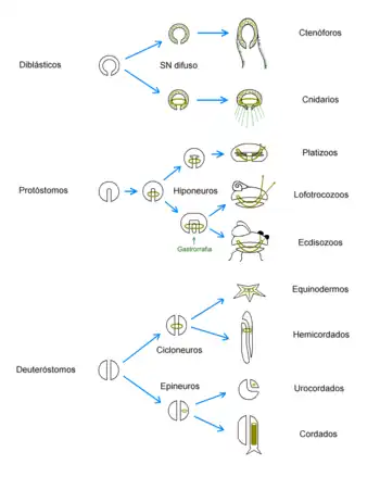 - Protóstomos. Este grupo incluye los platelmintos, nemátodos, moluscos, anélidos y artrópodos. Cuentan con un sistema nervioso hiponeuro, es decir formado por ganglios cerebrales y cordones nerviosos ventrales.[27] Los ganglios que forman el cerebro se sitúan alrededor del esófago, con conectivos periesofágicos que los unen a las cadenas nerviosas que recorren ventralmente el cuerpo del animal, en posición inferior respecto al tubo digestivo.[26]