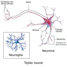Las neuronas son las células que constituyen la unidad fundamental básica del sistema nervioso, se encuentran conectadas entre sí de manera compleja y tienen la propiedad de generar, propagar, codificar y conducir señales por medio de gradientes electroquímicos a nivel de membrana axonal y de neurotransmisores a nivel de sinapsis y receptores. Los tejidos de sostén o mantenimiento están formado por las células gliales (neuroglia) y un sistema vascular especializado.[8][11]