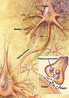 Se llama sinapsis a la comunicación funcional que se establece entre dos neuronas o entre una neurona y una célula muscular, mediante la sinapsis el impulso nervioso puede circular a través de varias neuronas enlazadas.[14] La neurona de la que parte el impulso se llama presináptica y la que lo recibe se denomina postsináptica. Entre ambas existe un espacio que recibe el nombre de espacio sináptico, el cual separa las membranas de las dos células aledañas. Pueden distinguirse dos tipos de sinapsis: