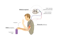 Se llama reflejo al proceso por el cual se produce una respuesta involuntaria, fácilmente predecible, frente a un estímulo determinado. La estructura neuronal que da soporte a un reflejo se llama arco reflejo. En el arco reflejo se establecen cinco componente: el receptor, la vía aferente encargada de incorporar la información desde los receptores, el centro reflejo de integración, la vía eferente que lleva la información de salida y el órgano efector que puede ser un músculo en los reflejos motores o una glándula en los reflejos secretores. Muchos de los reflejos son movimientos no voluntarios de una parte del cuerpo en respuesta a un estímulo. En los vertebrados los reflejos son producidos en general mediante circuitos nerviosos mediados por neuronas situadas en la médula espinal, sin intervención del encéfalo.[2]