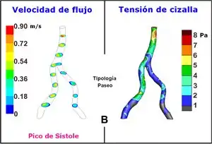 Cuando la velocidad del fluido en la arteria aumenta, el flujo pasa de laminar a turbulento y las partículas en lugar de desplazarse como láminas concéntricas se desplazan formando torbellinos.