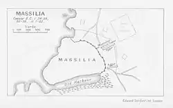 La ciudad de Massilia [lower-alpha 1] era una colonia focia[1] fundada en 600 a. C., un punto de cultura griega que controlaba el comercio del sur de la Galia, expandió su cultura y arte y fundó numerosas colonias propias en la zona.[2] Estaba construida sobre tres colinas y dos barrancos que llegaban abrúptamente al mar, lo que hacia que solamente se comunicase por tierra a través de un istmo, y también contaba con un excelente puerto natural.[3][4] En su lado sur se ubicaban arsenales, talleres y el muelle, al este una muralla sólida y apoyada por numerosas torres defendía el punto de comunicación terrestre. Su puerta principal era el comienzo de la vía Aurelia, que la comunicaba con Hispania. Tenía notables templos y edificios públicos.[5]
