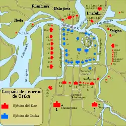 El 19 de diciembre[35] dio inicio la «campaña de Invierno» (大坂冬の陣 Ōsaka Fuyu no Jin?), cuando 3000 soldados del Ejército del Este, al mando de Hachisuka Yoshishige, atacaron una fortaleza ubicada en la desembocadura del río Kizu, defendida por 800 hombres bajo el mando de Akashi Morishige. Utilizando 40 botes, los hombres de Yoshishige cruzaron el río, incendiaron la fortaleza y aseguraron el sitio.[36]