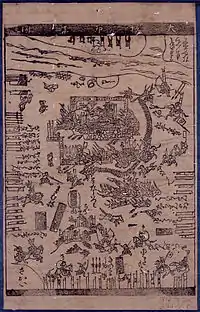 ![]() Ilustración del libro de François Caron «El incendio del castillo de Osaka». | ||||