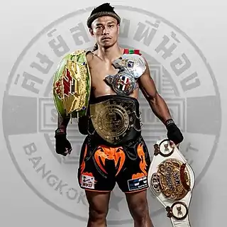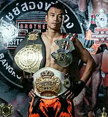 ![]() Sitthichai con los cinturones de Glory, Kunlun, WLF y Lumpinee en 2017 | ||
