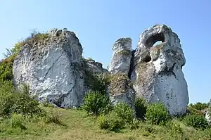 Los primeros habitantes que llegan a Silesia datan del tiempo interglaciar Würm perteneciendo a la cultura Micoquien-Prądnik.[2] En el sur de Skarżyce se ha encontrado un asentamiento Paleolítico donde existen varias Cuevas ubicadas en enormes rocas calizas. La Roca más conocida es la llamada “Gran ventanal”, el nombre lo debe a tener una característica de una torre con una cueva en la parte superior. El ventanal, que pertenece a de un sistema de cuevas prehistóricas, tiene 5 m de diámetro y 7 m de longitud. Por debajo de la ventana hay una de las dos entradas a la cueva.