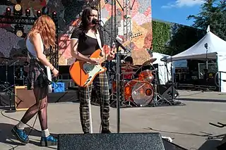 ![]() Skating Polly en el festival Bumbershoot 2018, en Seattle. De izquierda a derecha: Kelli Mayo, Peyton Bighorse y Kurtis Mayo | ||