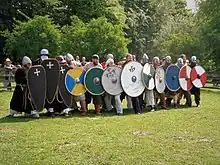 El skjaldborg (del nórdico antiguo: muro de escudos[1]) era una formación típica de los vikingos que consistía en un cuerpo de guerreros colocados suficientemente cerca como para sobreponer sus escudos de forma que se protegían unos a otros formando una barrera compacta.[2] Las imágenes en las piedras de Stora Hammars de Gotland muestran escudos más pequeños que se superponen por menos de un cuarto de su anchura, por lo que es razonable pensar que el posicionamiento variaba según las circunstancias, y posiblemente varios grupos se organizaban en diferentes skjaldborg de apoyo mutuo, mientras que otras unidades aprovechaban para posicionarse por su cuenta y atacar por sorpresa.