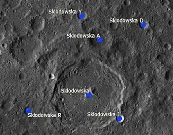 Por convención estos elementos son identificados en los mapas lunares poniendo la letra en el lado del punto medio del cráter que está más cercano a Sklodowska.