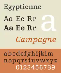 El término "Egyptian" fue adoptado por las fundiciones francesas y alemanas, donde se convirtió en "Egyptienne". Un estilo más ligero, con una sola anchura de trazos, se denominaba "letra de grabador", ya que se asemejaba a la estructura monolínea de los grabados en metal. El término "slab serif" es relativamente reciente, posiblemente del siglo XX.[25]