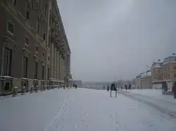 Según se construía el nuevo palacio, la cuesta fue rediseñada para convertirse en su grandiosa antecámara barroca, y las estructuras y jardines del lado sur fueron consecuentemente sustituidos por edificios más prestigiosos de piedra. Aunque el exterior del palacio estaba más o menos completado en la década de 1750, las obras en la cuesta, la entrada principal del palacio, todavía estaban en marcha a finales de ese siglo.[1]