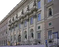 Aunque las cuatro fachadas del Palacio Real están construidas en ladrillos y comparten un programa unitario, cada una de ellas tenía un diseño diferente de acuerdo con sus diferentes funciones. La fachada sur, que representa a la Nación y oculta la Capilla Real y el Rikssal (la sala del trono real), da hacia la entrada principal del palacio y es consecuentemente la más grandiosa de las cuatro. Está dominada por un arco triunfal romano de caliza y decorada con seis trofeos de guerra, cuatro escenas de secuestro de Bouchardon y dieciséis relieves que representan escenas mitológicas. La balaustrada sobre la parte central iba originalmente a ser decorada con una serie de esculturas. Mientras que la alta parte central, de 115 metros de anchura, está flanqueada por un ala este de 48 metros de longitud, la correspondiente ala oeste tiene solo 11 metros, ya que los planes originales del arquitecto de demoler la catedral medieval fueron ignorados. Las estatuas en las ocho hornacinas, que datan de 1899–1902, representan a suecos célebres de finales del siglo XVII: Dahlbergh, M. Stenbock, Stiernhielm, Polhem, Tessin, Adelcrantz, Linneo y von Dalin.[3][4]