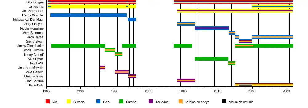 ![]() Ginger Reyes (izquierda), Billy Corgan, Jimmy Chamberlin (atrás) y Jeff Schroeder en un concierto en Luxemburgo en 2007. | ||