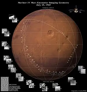 En julio de 1965, Mariner 4 logró un sobrevuelo de Marte con un retorno de datos, proporcionando al público y a los científicos imágenes de Marte dramáticamente más cercanas.[6] Durante el sobrevuelo, el Mariner 4 tomó 21 fotografías que representan aproximadamente el 1% de la superficie de Marte.[6] Marte no fue mapeado globalmente hasta el orbitador Mariner 9, que en el transcurso de 1972 a 1973 tomó miles de imágenes de hasta 100 metros por píxel.[6] Las observaciones de los telescopios terrestres ópticos de la Tierra tienen que mirar a través de la atmósfera, lo que hace que las imágenes se vuelvan borrosas.[7]