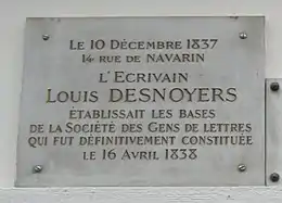 - Jules Claretie (16 de octubre de 1885). [disponible en Gallica La Vie à Paris. Le Déménagement de la Société des gens de lettres - Le présent et le passé] (en francés) (8934). París: Le Temps. p. 2. Consultado el 18 de enero de 2022.