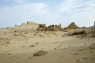 La zona arqueológica del poblado (kom) tiene una forma ovalada, de 660 m de norte a sur y 350 m de este a oeste, y está atravesada por un dromos pavimentado de 400 m de longitud. El principal testimonio arqueológico son los monumentales témenos de adobe gris claro ubicados al noroeste, con muros conservados en algunos puntos de hasta 15 m de altura, de planta rectangular irregular. En el interior de este recinto aún se pueden reconocer varios edificios, principalmente construidos en adobe y mampostería de piedra.