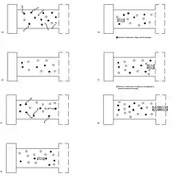 - Los átomos o moléculas del material fluorescente son violados por bombardeo con luz o energía eléctrica (a) y se colocan en niveles de energía más altos (b). Se ven debilitados por emisión espontánea y la mayor parte de los fotones emitidos que se encuentran desplazados a lo largo del eje del tubo generan más potencia por emisión estimulada de otros átomos excitados siendo así amplificada la luz (d). En el espejo reflectante (e) los fotones se reflejan hacia atrás a lo largo del tubo para poder ser mayormente amplificados. (f) En la ventana de salida algunos fotones se reflejan para continuar amplificándose y el resto se transforman formando el haz saliente. Las etapas anteriores se producen casi simultáneamente.