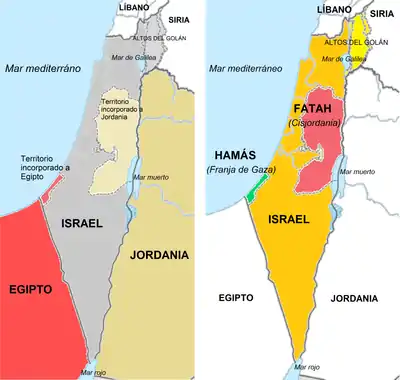 Solución de tres Estados contemporánea: el Estado de Palestina está gobernado de facto por las organizaciones de Hamás y Fatah.