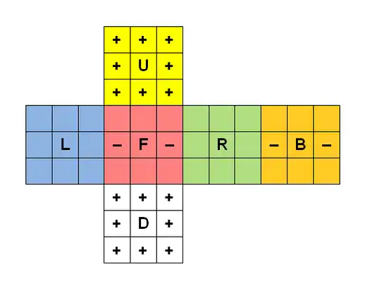 Las letras L, R, F, B, U y D indican un cuarto de vuelta en el sentido de las agujas del reloj de la cara izquierda, derecha, delantera, trasera, arriba y abajo, respectivamente. Las medias vueltas se indican añadiendo un 2. Un cuarto de vuelta en sentido antihorario se indica añadiendo un símbolo de prima (′).