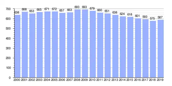 | Gráfica de evolución demográfica de Somozas entre 2000 y 2019 |