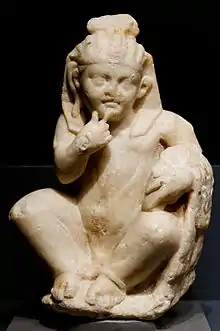 Como dios-niño, aparece desnudo, de pie, o sentado sobre una flor de loto, lleva nemes, una corona hemhem (corona divina y real, que consta de tres coronas atef y usado por los reyes difuntos y algunos dioses-niños) y el dedo índice de la mano derecha se lo lleva hacia su boca.
