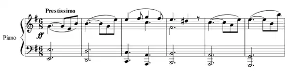 El segundo movimiento, Prestissimo, está en mi menor, en compás de 6/8 y responde a la forma sonata. Sigue al primero sin que haya finalizado su último acorde, un proceso similar al empleado antes por el compositor, por ejemplo, para ligar el segundo y tercer movimiento en su Sonata n.º 13. Aunque responde a la forma sonata, presenta el carácter de un scherzo y pasajes contrapuntísticos. Por su forma de sonata, sería típico de un primer movimiento de Beethoven si no fuera por su sucinto desarrollo y su extrema brevedad. Hay dos grupos temáticos, con el primero encabezado por un tema asertivo que sugiere más que vagamente el estilo pianístico de Robert Schumann. El segundo tema, más apagado al principio, genera tensión y energía a medida que avanza. Tras un conciso desarrollo, una interesante repetición conduce a una escueta coda.[3]