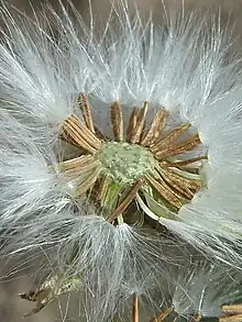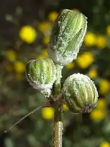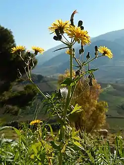 Es una especie anual, bienal o perenne de 20 cm hasta 1 m de altura, con tallos erectos, ramificados o no, huecos y longitudinalmente surcados, glabros o frecuentemente cubiertos de pelos glandulares y, debajo de los capítulos, donde pueden ser densamente aracnoideo-blanquecino; una rosta basal de hojas es eventual y las hojas caulinares son abrazadoras, muy variables, con aurículas finas y agudas, pinnatisectas, generalmente en estrechos/filiformes lóbulos, con o, generalmente, sin pequeñas espinas en los márgenes. La inflorescencia, en corimbo, consiste en múltiples capítulos pedúnculados con un involucro frecuentemente densamente aracnoideo-blanquecino en la parte inferior —y también en el ápice de los pedúnculos— de las brácteas que son herbáceas, más grandes del exterior hacía el interior, glabras o con pelos glanduliferos y con las lígulas con limbo apicalmente pentadentado, amarillas y a menudo con una banda longitudinal violácea en su envés. El receptáculo es convexo, desnudo y alveolado. Las cipselas, de cuerpo comprimido y finamente tuberculado, son estrechamente oblanceoladas, de color pardo y con 3-4 costillas longitudinales de cada lado; son coronadas por un vilano, caedizo, de finísimos pelos blancos escabridos o barbelados.[1][2]