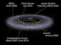 Después de su asistencia gravitatoria en el planeta Júpiter, la New Horizons está en una trayectoria interestelar vía Plutón. El 7 de marzo de 2008, la New Horizons (en español: Nuevos Horizontes) estaba a 9,37 AU del Sol y alejándose a 3,9 AU por año, sin embargo comenzará a disminuir su velocidad de escape a solo 2,5 AU por año a la medida que se aleja del Sol, así que nunca alcanzará a la Voyager. A principios del 2011, estaba viajando a 3,356 AU/año (15,91 km/s) en relación con el Sol.[4]