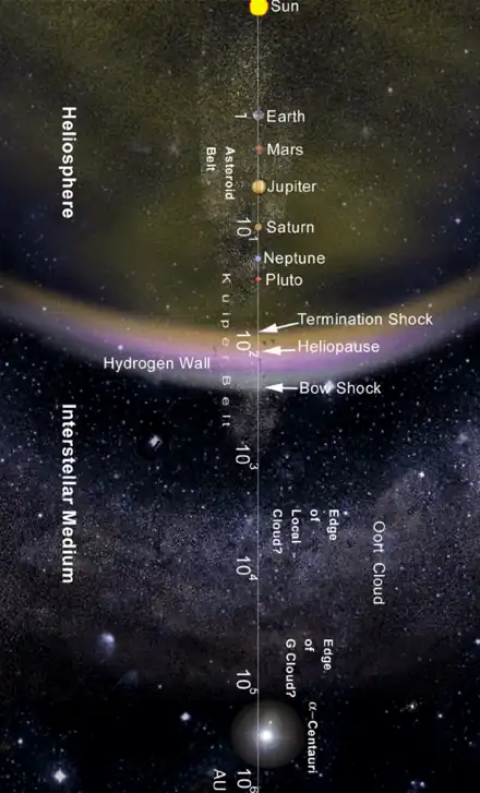 Incluso aunque el frente de choque de terminación ocurre tan cerca como 80-100 AU, la máxima extensión de la influencia del campo gravitacional del Sol, la esfera Hill/Roche, está en 230.000 AU[2] (1,1 parsec o 3,6 años luz).[2] El sistema estelar más cercano es el de Alfa Centauri a 1,34 parsec (4,36 años luz).