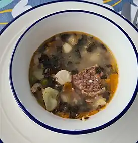 La sopa incluye carne, cebolla, zanahoria, maíz pelado, trigo pelado, ajo, ají y otros, existen variantes de la sopa según zonas y comunidades.[5]