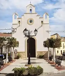 La torre (siglo XIX) presenta una decoración neobarroca, destacanto los cuatro vanos para las campanas, el reloj y los cuatro santos que flanquean las esquinas: San Pedro, San Pablo, San Roque y San José.