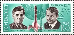 Sello de la Unión Soviética celebrando la misión Soyuz 12.