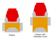 La cápsula Dragon consiste en una tapa frontal en forma de cono, la cápsula balística tradicional y un módulo de carga no presurizado con dos paneles solares.[60] La cápsula utiliza un escudo de PICA-X basado en una variante propietaria del PICA de la NASA que protege a la cápsula durante la reentrada incluso a velocidades encontradas en misiones Lunares o Marcianas.[61][62][63] También es reutilizable con posibilidad de varias misiones.[60] El "maletero" no se recupera y tanto este como su contenido se separan de la cápsula para arder en la reentrada atmosférica.[64] La primera vez que el "maletero" se utilizó para llevar carga fue en la misión SpaceX CRS-2.