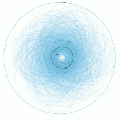 Gráfico de las órbitas de los asteroides potencialmente peligrosos conocidos (tamaño de más de 140 metros (460 pies) y que pasan dentro de los 7.6 millones de kilómetros (4.7 × 106 millas) de la órbita de la Tierra) a principios de 2013 (imagen alternativa).
