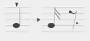 - También se pueden utilizar signos como el un punto, como en el staccato o una cuña vertical, como en el staccatissimo. Este signo generalmente se coloca por encima de la nota si la plica apunta hacia abajo y por debajo si la plica apunta hacia arriba. En el caso de las redondas que carecen de plicas, se actúa como si la tuviesen; de tal forma que el signo se colocará por encima o por debajo de la nota en función de su ubicación en el pentagrama. Por último, cuando las direcciones de las plicas son distintas el signo de articulación se dibuja siempre por encima. La ubicación del signo es en el siguiente espacio de la cabeza de la nota, tanto si la nota se encuentra en una línea como en un espacio del pentagrama.