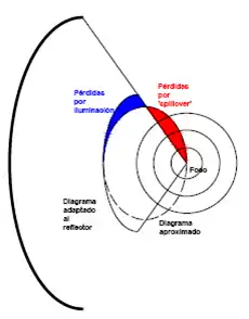 Spillover es un efecto que se produce en las antenas parabólicas cuando la radiación emitida por el alimentador primario situado en el foco de la parábola desborda la superficie del plato de la antena provocando una pérdida de ganancia en la señal.