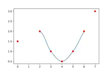 La siguiente es una implementación del spline de Catmull-Rom en Python, que produce el gráfico que se muestra a continuación.