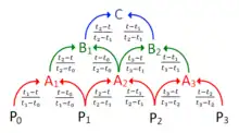 A3= (t3 - t) / (t3 - t2) * P2 + (t - t2) / (t3 - t2) * P3