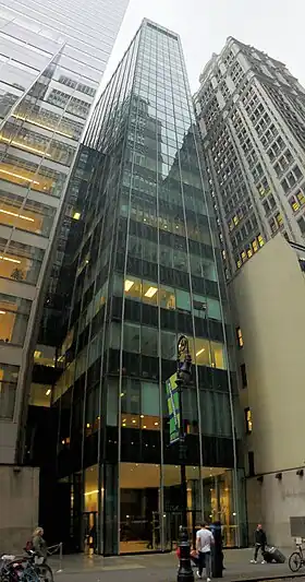 La fachada del edificio es un ejemplo temprano de un muro cortina de vidrio, una fachada no estructural frente al marco estructural de acero.[28] Su diseño incorporó elementos de proyectos cercanos similares, como la Sede de la Organización de las Naciones Unidas en First Avenue (1947), Lever House en Park Avenue (1950-1952) y el Corning Glass Building en Fifth Avenue (1959).[32] El edificio de la Secretaría había utilizado vidrio teñido de verde con doble acristalamiento,[33] : 127–128 mientras que la Lever House usaba tanto ventanas de paneles fijos acristalados como secciones intercaladas de vidrio teñido de verde y verde oscuro.[34] El Corning Glass Building, otro proyecto de Harris y Abramovitz, utilizó láminas de "vidrio translúcido frente a paneles de metal pintado", así como parteluces de aluminio entrelazados. : 154, 304