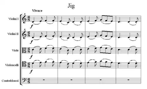 - I. Giga: Vivace (alternado entre el compás de 6/8 y de 9/8)