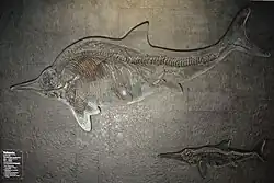 Un famoso fósil representa a una madre y su bebé que murieron en el parto (los ictiosaurios eran vivíparos). Esto probó que los ictiosaurios jóvenes nacían sacando primero su cola, precisamente como los cétaceos, para evitar que se ahogaran antes de salir del canal de parto.[14]