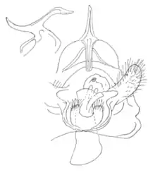 Armadura genital: Uncus estrecho, gancho fuerte, gnathi (mandíbula) estrecha, totalmente fusionada y formando una estructura estrecha y arcos. Tegumen de ancho moderado. Valva poco desarrollada, corta, membranosa. El pene es relativamente corto, aunque es significativamente más largo que la valva, es muy robusto y se levanta, con un cornutus interno fuerte; cultivo inferior en la lúnula, con ángulos y formando pequeñas lábidas. Vinculum muy grande; saccus sin desarrollar. Placas de segmento 8 no diferenciadas.[1]